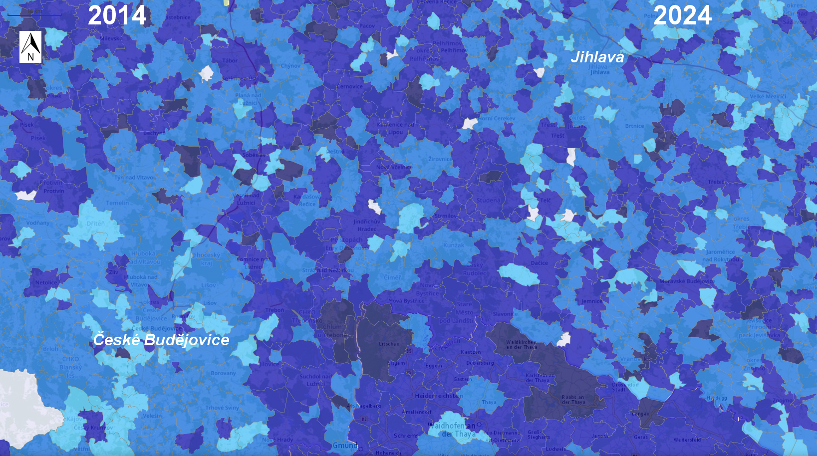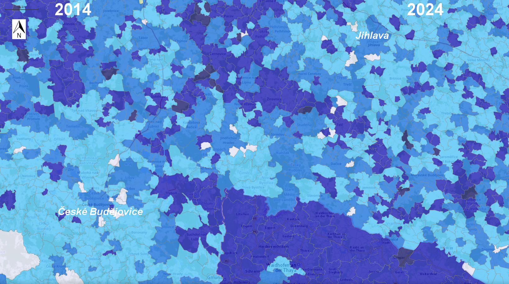 České Budějovice-Jihlava Region: Old Age Dependency Ratio 2014 (left) | 2024 (right)