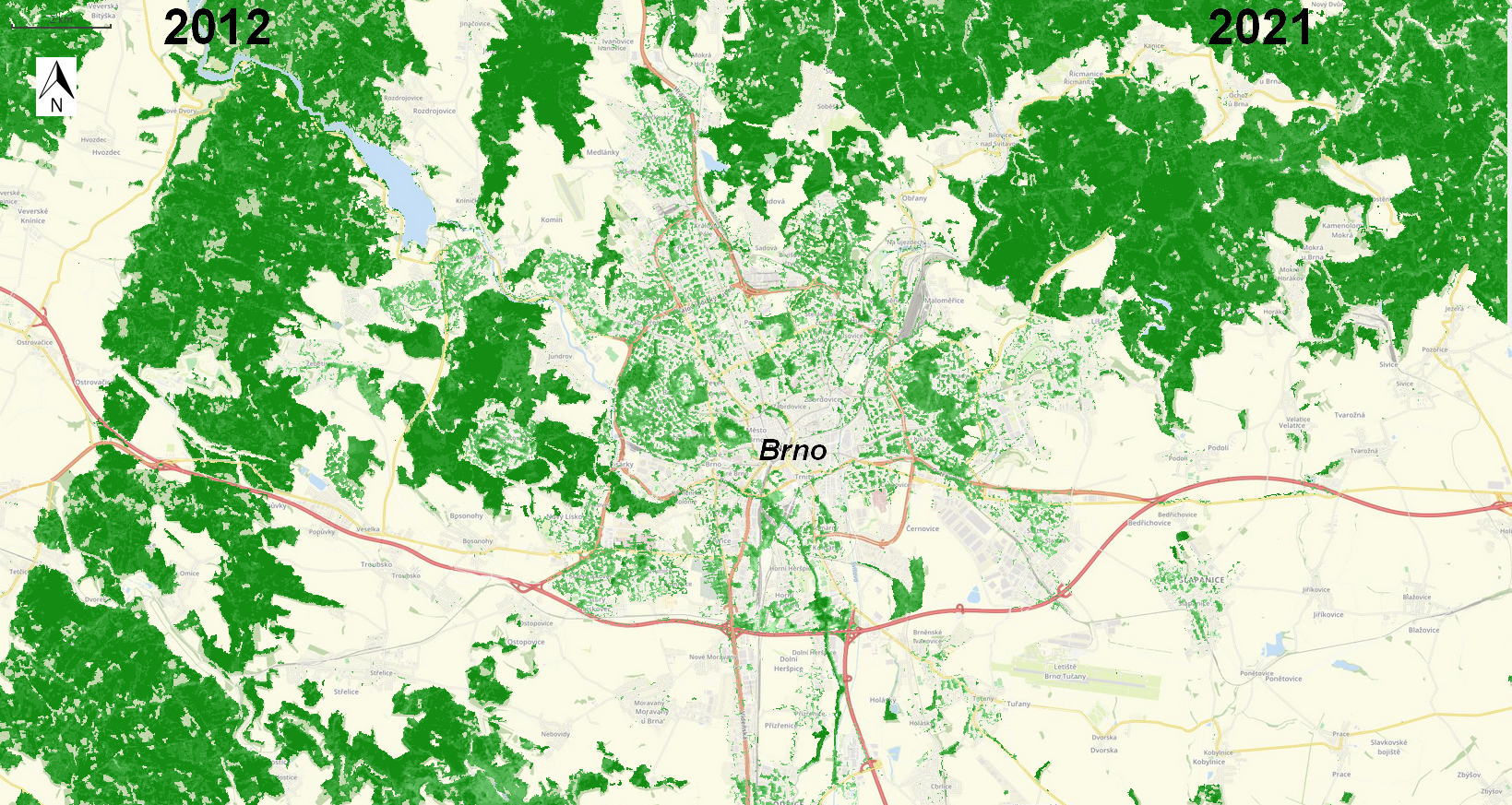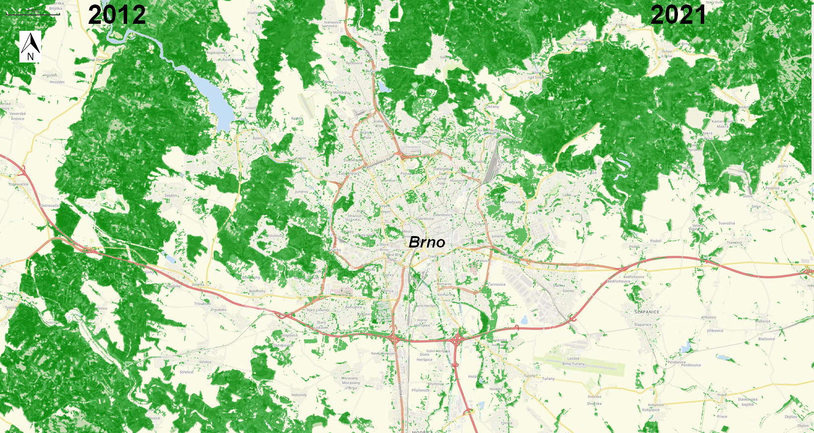 Brno Region: Tree Cover Density 2012 (left) | 2021 (right)