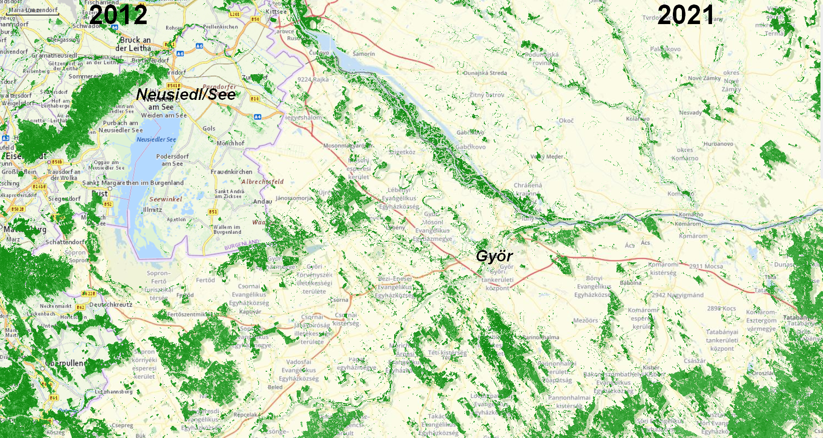 Győr Region: Tree Cover Density 2012 (left) | 2021 (right)