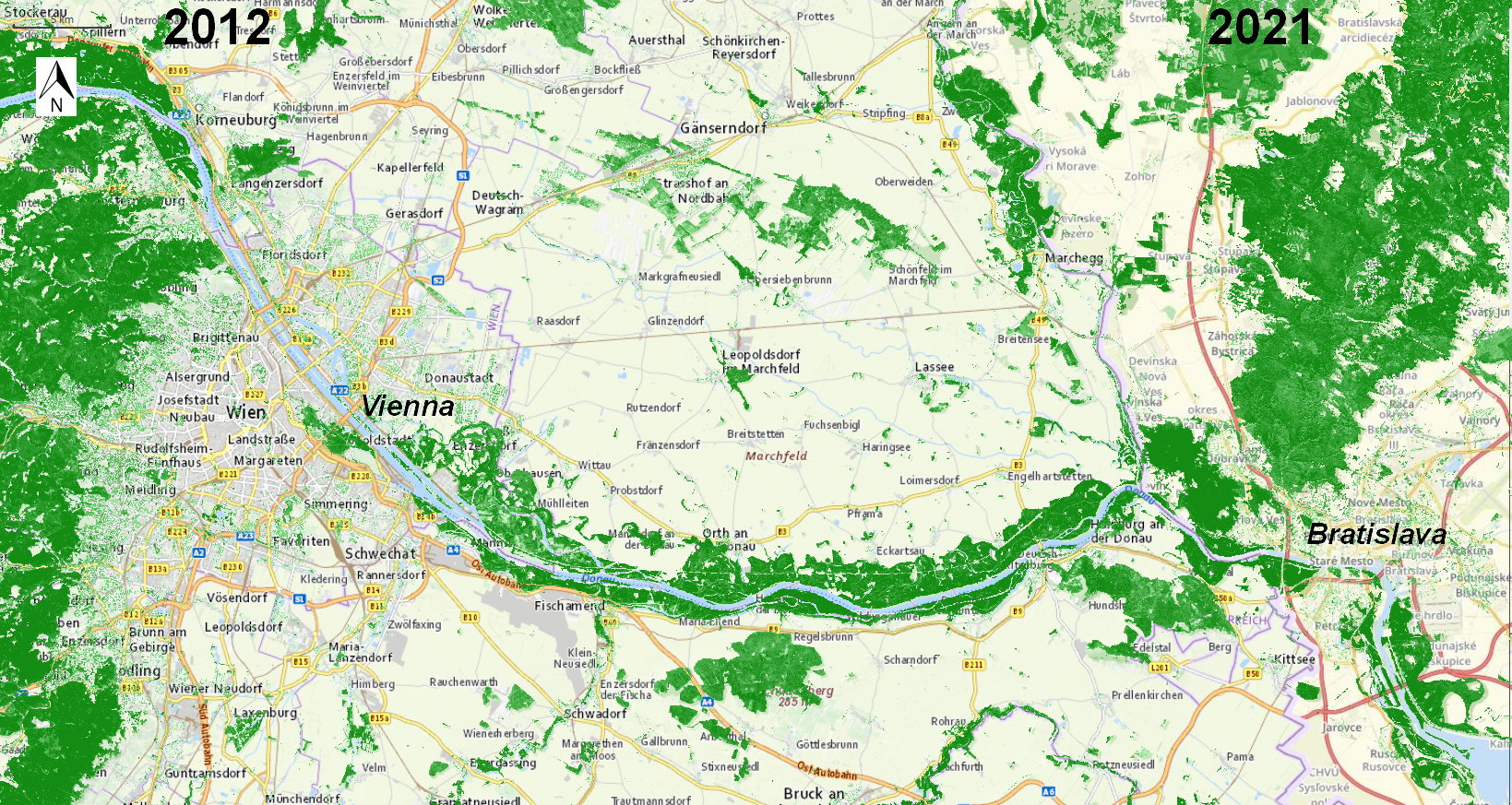 Vienna-Bratislava Region: Tree Cover Density 2012 (left) | 2021 (right)