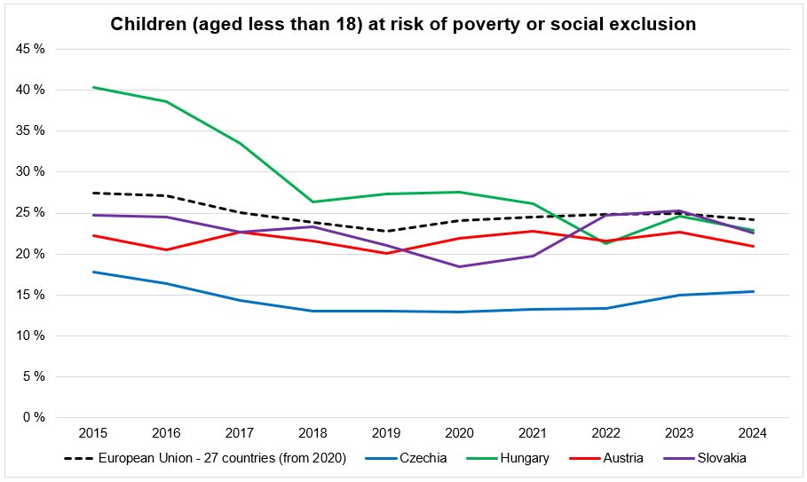 In keeping with the theme for November (World Children's Day), we want to take a look at the proportion of children (defined as those under the age of 18) who are at risk of poverty or social exclusion. The data for the Centrope countries show a similar trend in Austria, the Czech Republic, and Slovakia, which is also in line with the trend in the EU-27 as a whole. In Hungary, the proportion has been significantly higher in the past, levelling off around the EU average in 2018 and even falling below it at the beginning of the 2020s. Data source: https://ec.europa.eu/eurostat/databrowser/view/tepsr_lm412/default/table