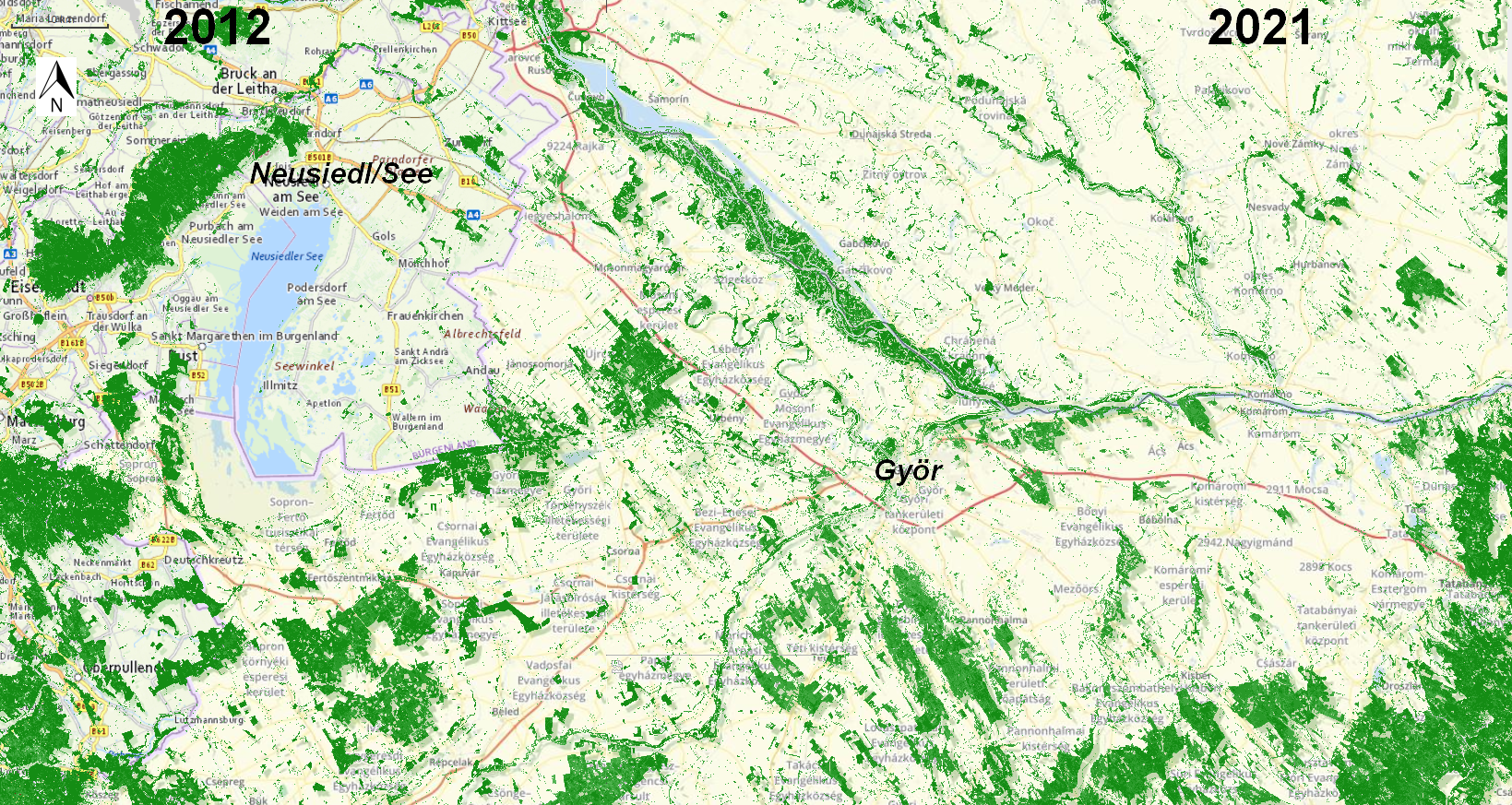 Győr Region: Tree Cover Density 2012 (left) | 2021 (right)